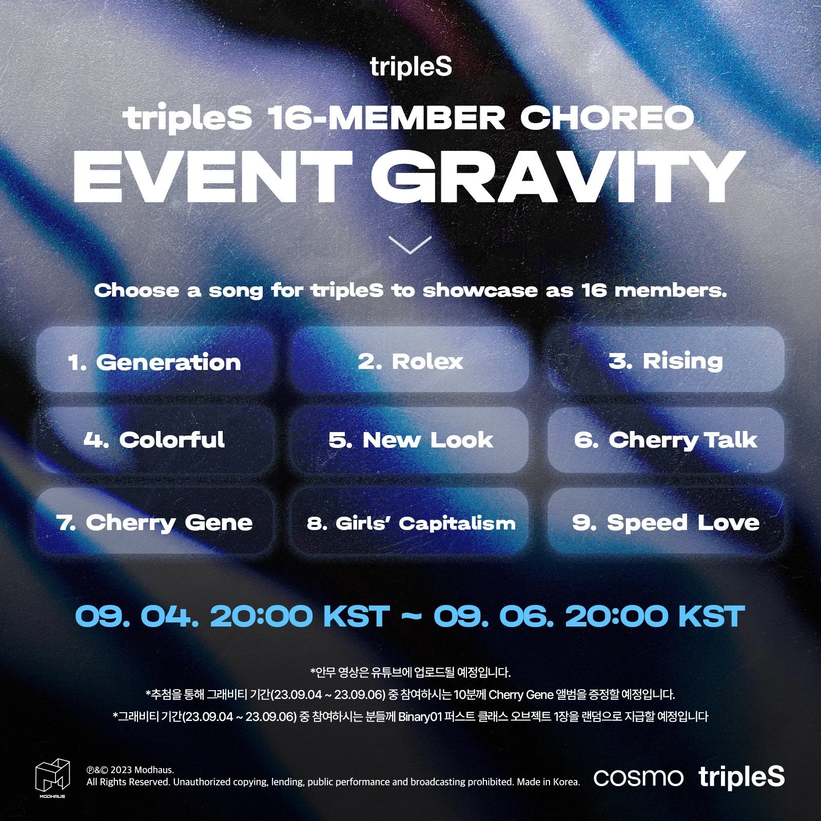 There were a total of 9 song candidates, with all of the songs being already released tripleS songs. Among them, the most voted song will have a performance video by all 16 members uploaded on tripleS' official YouTube channel.
