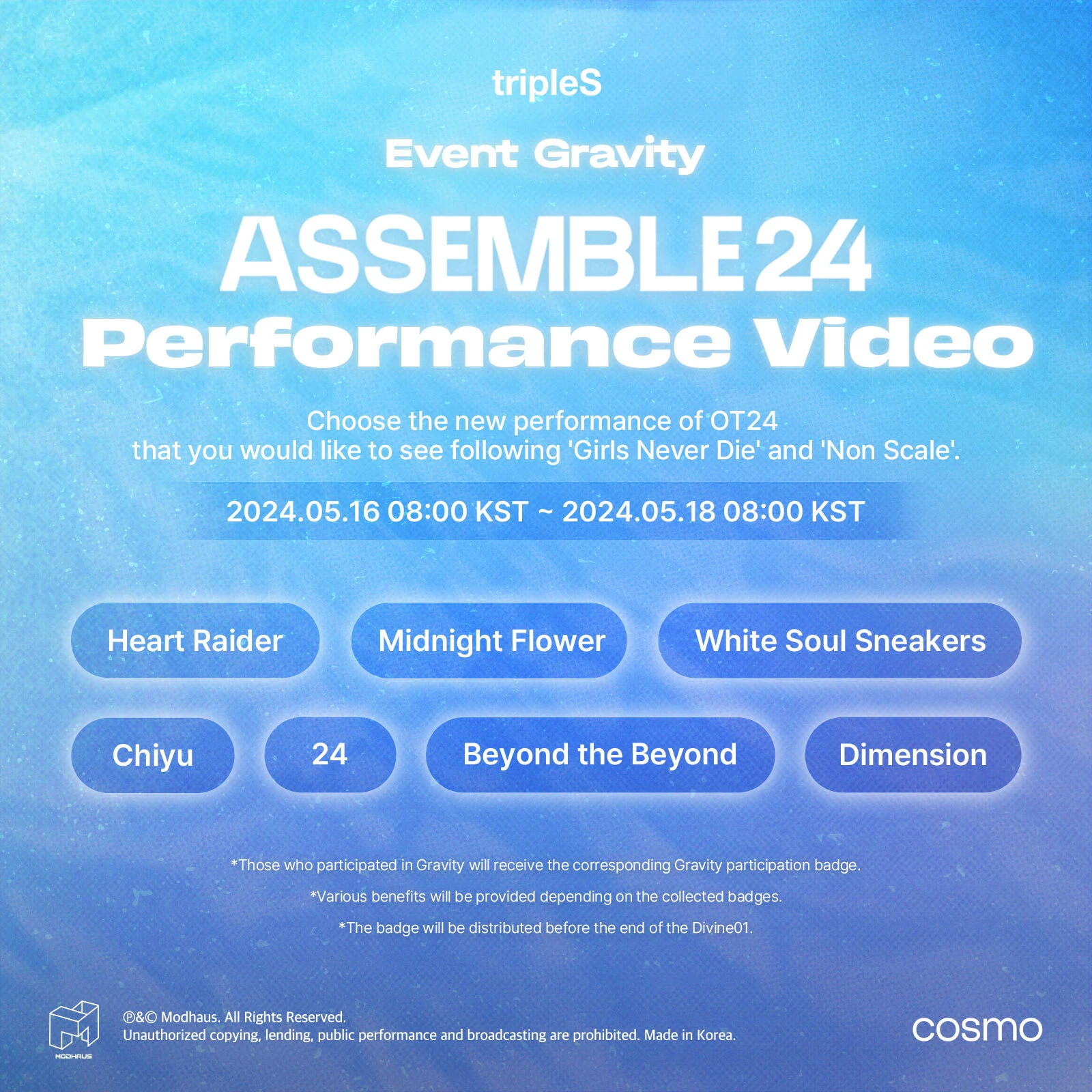 The fifteenth gravity, titled, "tripleS ASSEMBLE24 Performance Video", was announced May 15th, 2024 and took place between May 16-18.